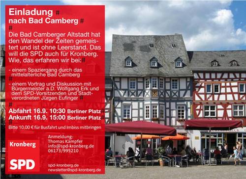 Am Vormittag des 16.9. führen wir eine Fahrt nach Bad Camberg durch, bei der wir uns Möglichkeiten zur Belebung einer Altstadt erklären lassen wollen. Weiteres erfahren Sie auf dieser Einladungskarte: