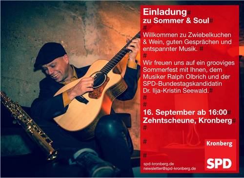 Die SPD Kronberg informiert mit Infoständen an den Samstagen vor der Wahl. Außerdem laden wir die Bürgerinnen und Bürger recht herzlich am 16.9. zu einer Fahrt nach Bad Camberg und zu unserem Sommerfest "Summer & Soul" ein.